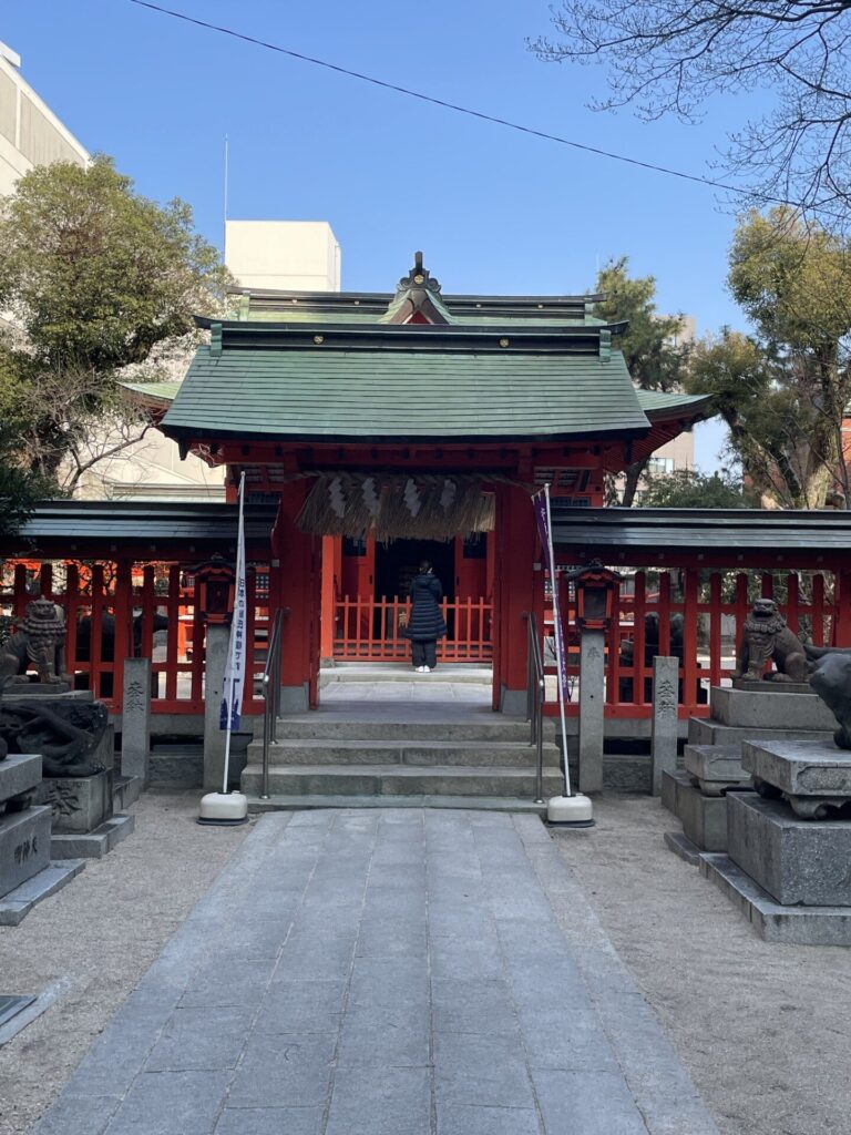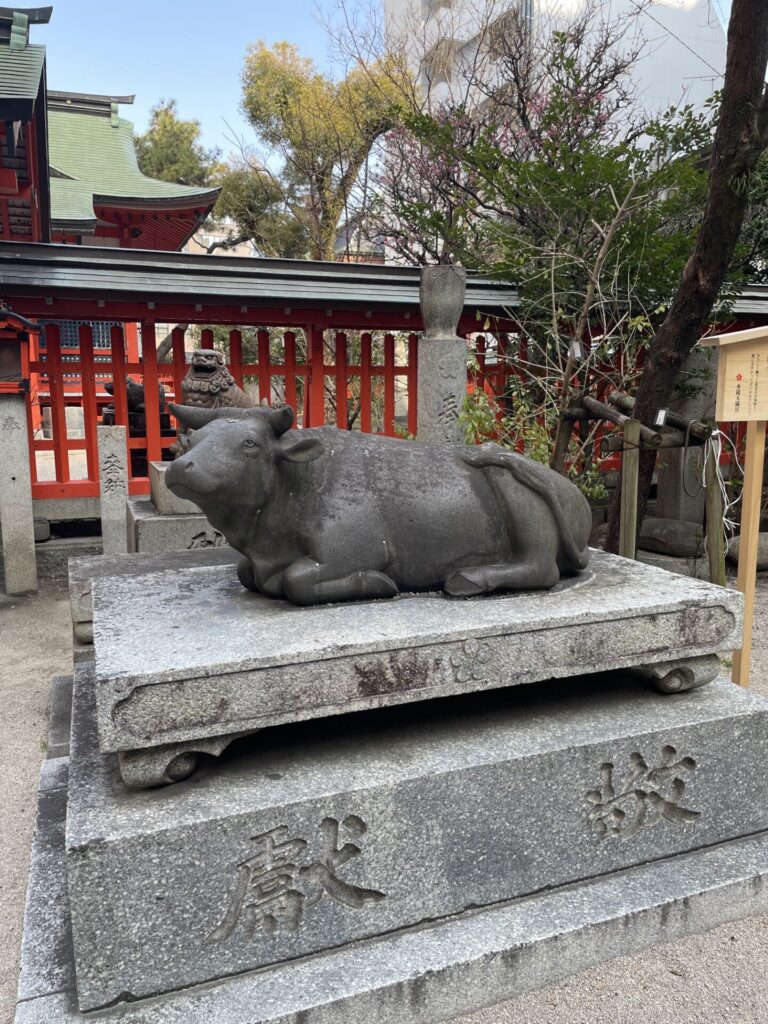 福岡天神に出張に行きました。天気も良かったし、東京より少し暖かいので朝散歩に出かけました。天神の中心に水鏡天満宮という神社があり菅原道真公をお祭りしています。本殿横の牛の石像の説明を読んでみると道真公は丑年生まれで牛をこよなく愛していたそうです。葬列では棺も牛が引いたそうです。
